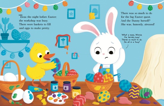 In this tale of heart reborn and remade, the Easter Bunny is a defiant one-bunny show, refusing all requests of help from the likes of Winnie the Easter duck and her friends, saying “Thank you, my friend, / but it has to be me.” and hopping out the door o make Easter happen all on her own.