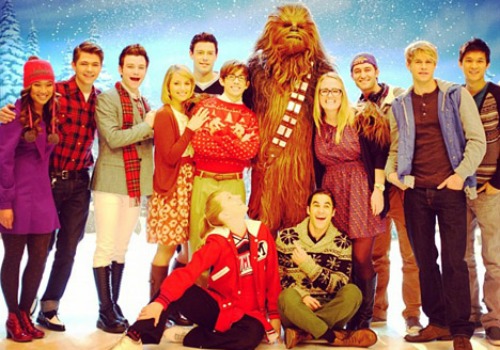 This year Glee wanted to invoke old-time 70s Christmas TV specials (the fact this time period is now considered ‘old-time’ disturbs in ways I can’t even articulate adequately) by having the New Directions gang appear on a TV special within the episode. It will evoke the Star Wars and Judy Garland holiday specials which explains, at least, why Chris Golfer (who plays Kurt) is hugging the most famnous Wookie of all.