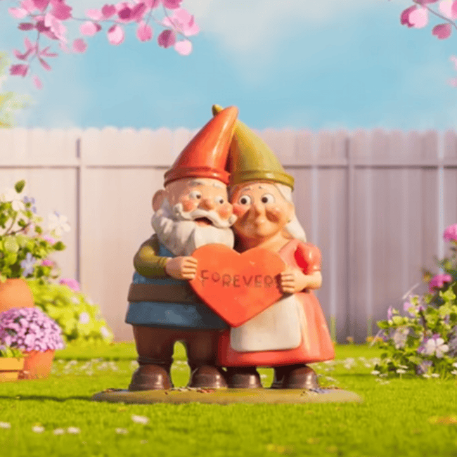The story begins in a cheerful and peaceful backyard garden, where brightly painted gnomes stand proudly among flowers and trimmed grass in quirky poses and scenarios. Bathed in sunlight and silence, their existence is static yet content. But their serene existence is disrupted when a golf ball arcs over a fence and lands among them, damaging one of their numbers beyond repair. More balls soon land, cracking statues, scattering fragments, shattering the calm, and so the gnomes must band together to battle their unseen, nebulous yet powerful adversary. (courtesy First Showing)